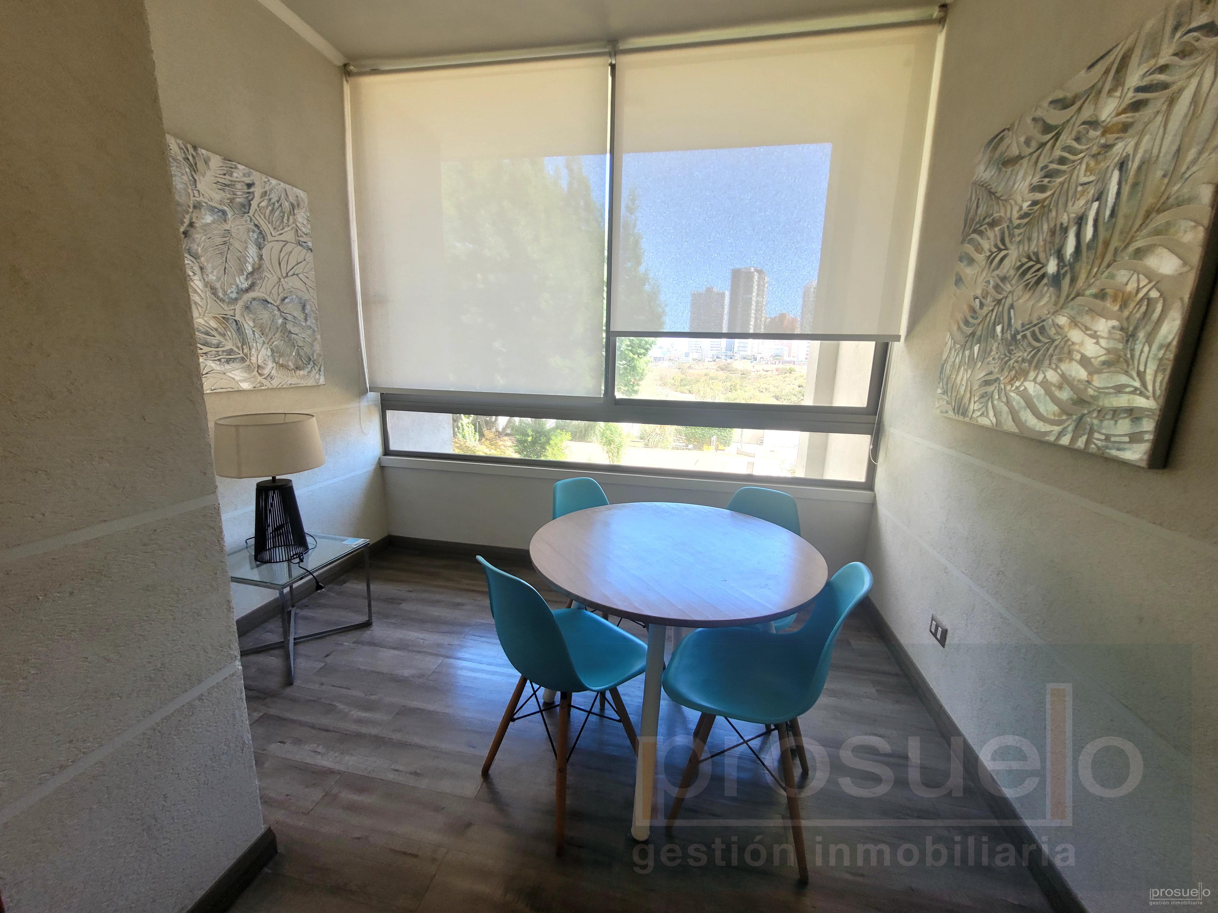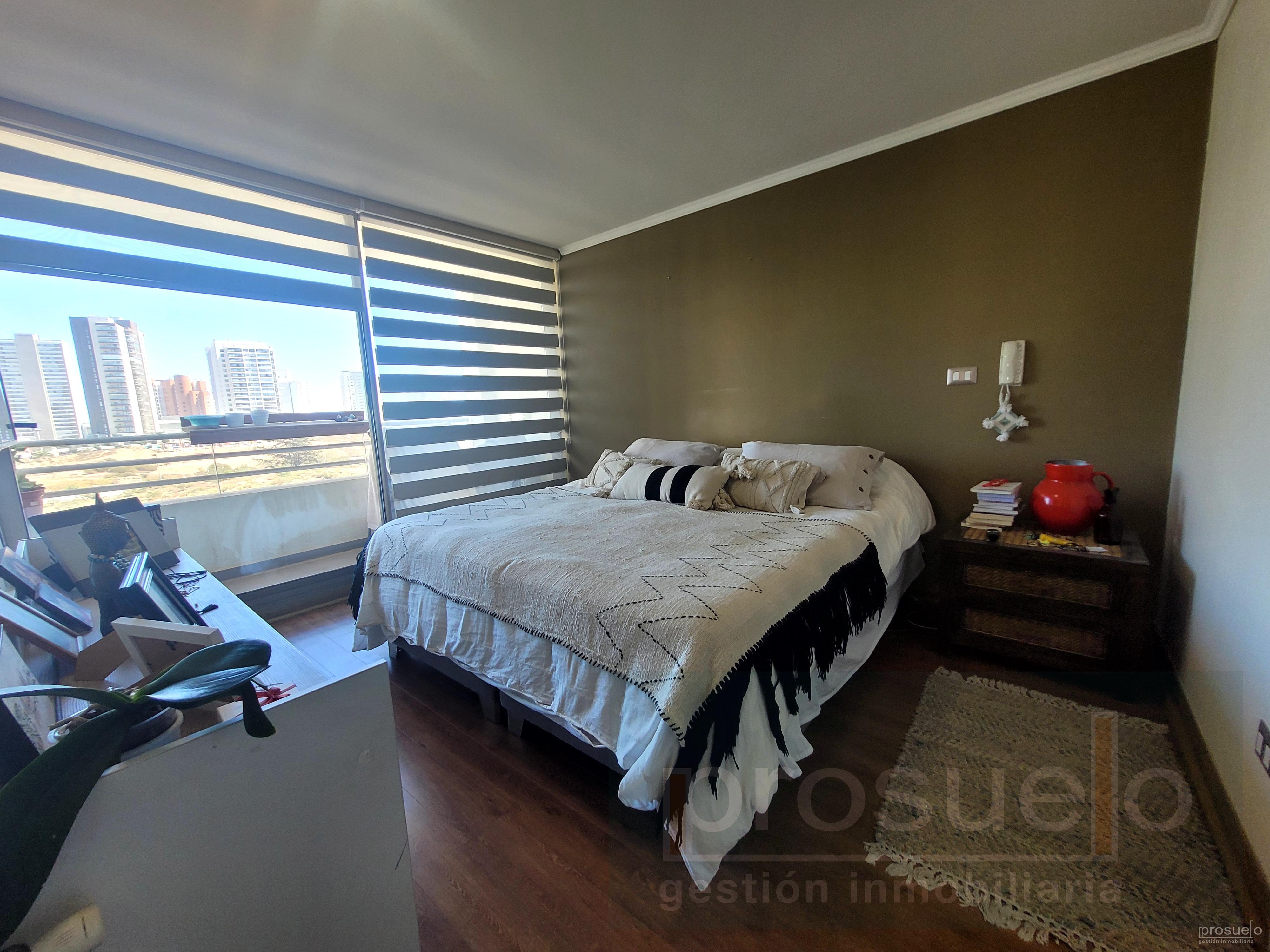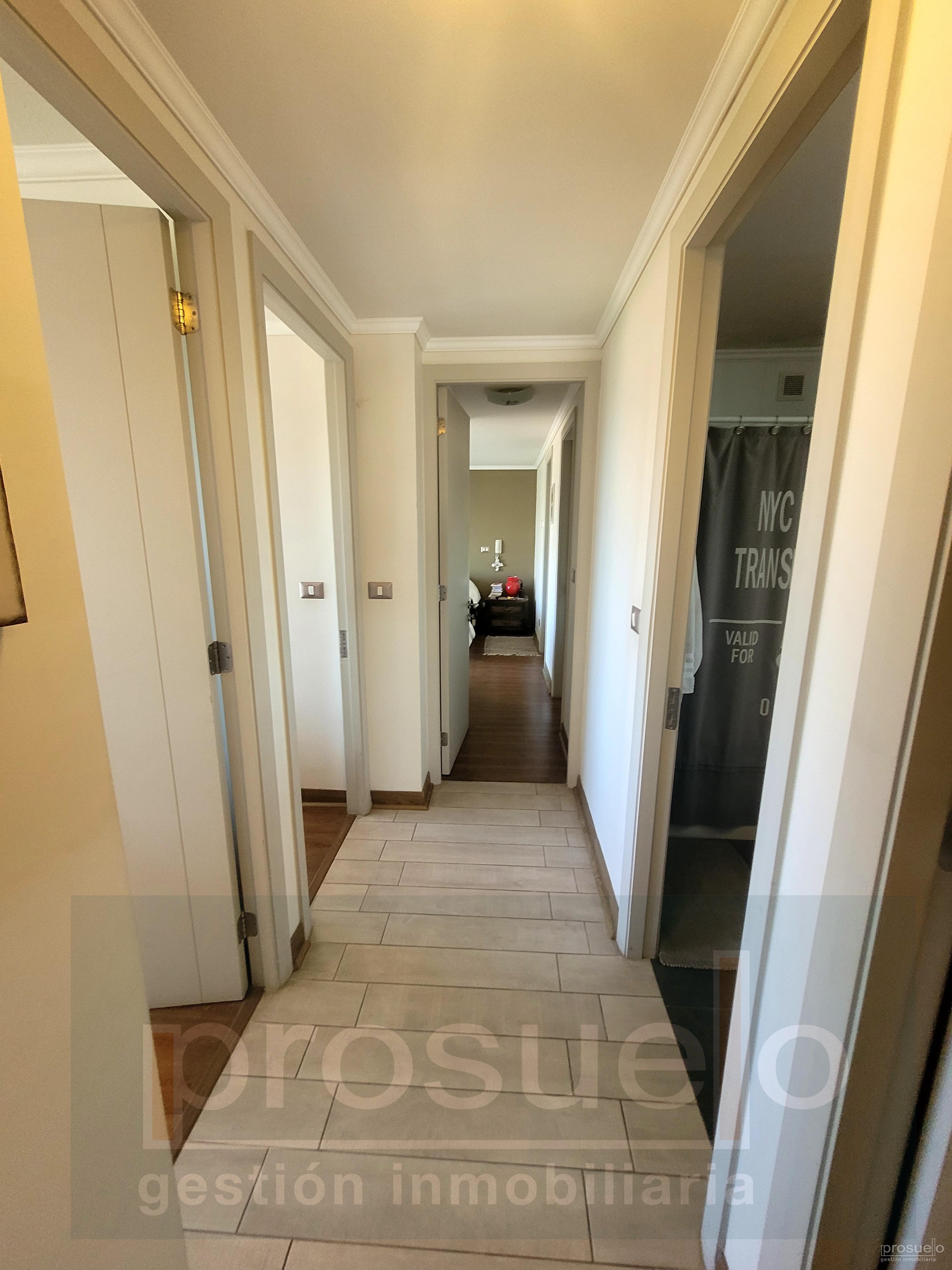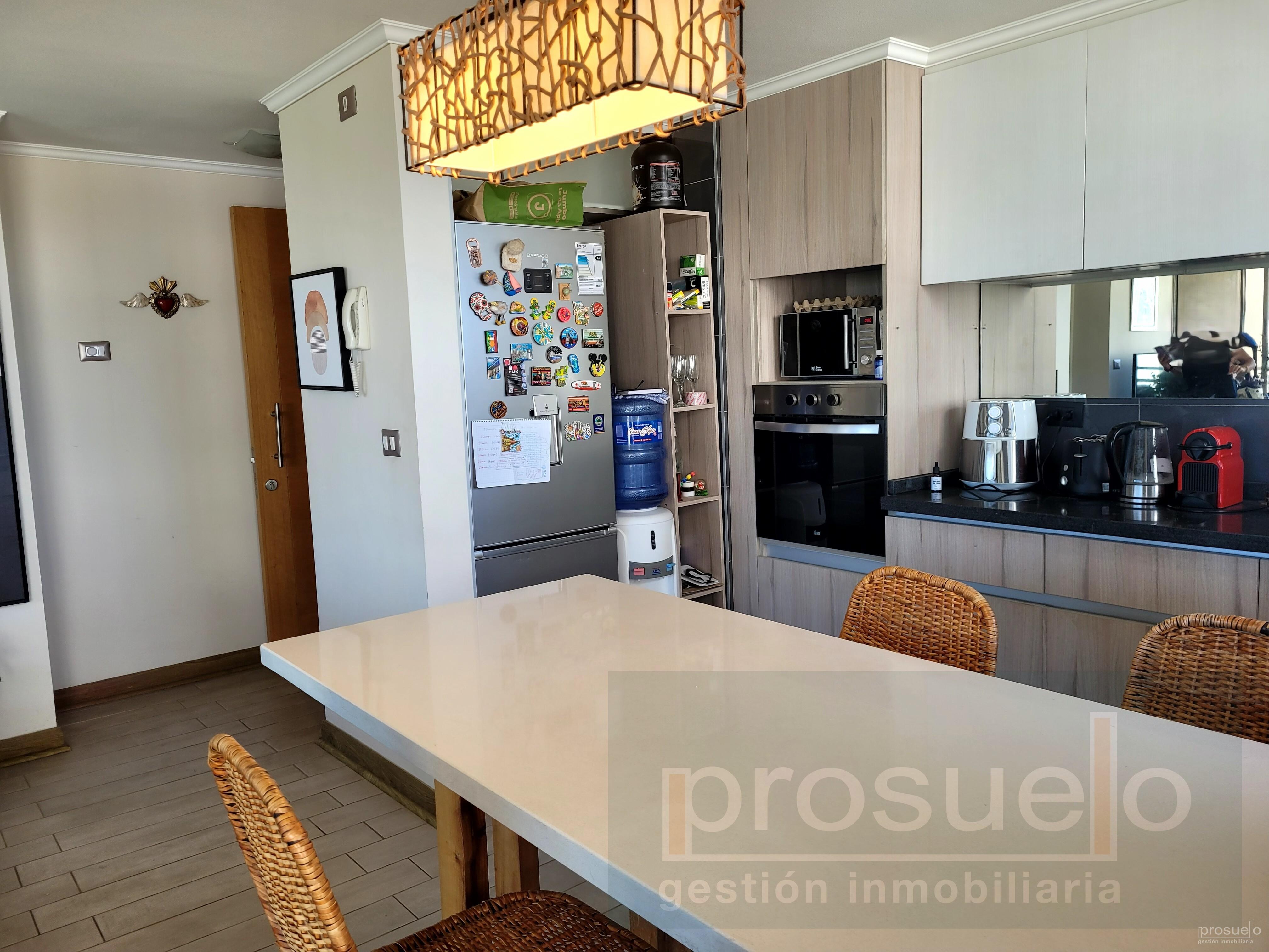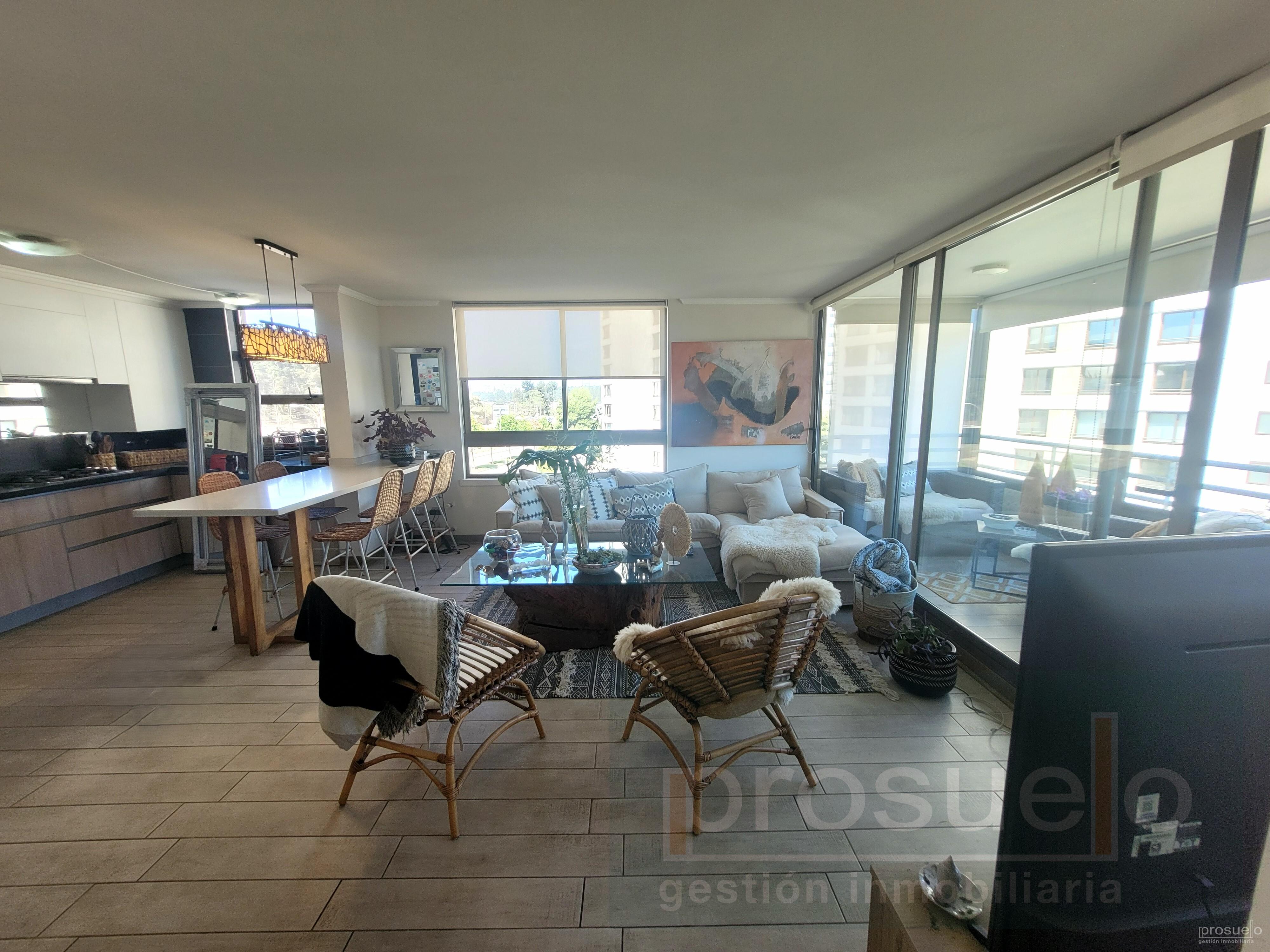 Amplio departamento esquina de 90 mt2 mas terraza cerrada con vista despejada de 8 mts con living comedor y cocina equipada integrada con mesón. Orientación Sur Poniente.